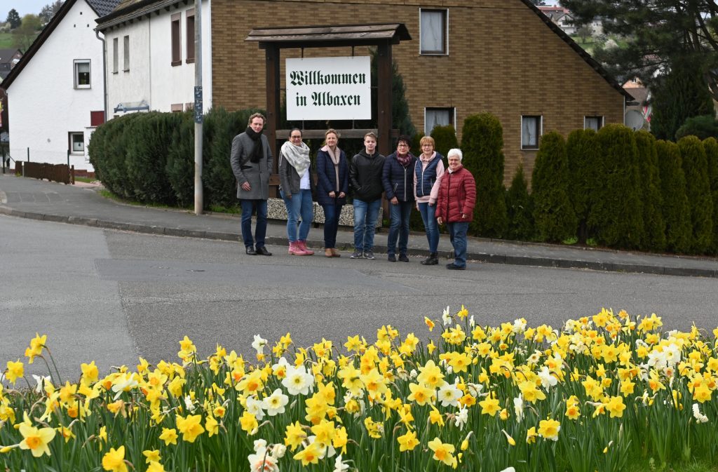 Dr. Olaf Peterschröder, Ulrike Drees, Simone Vieth, Henri Söffgen, Monika Rode, Dagmar von Heesen und Gisela Söffgen trafen sich zum Fototermin am Ortseingang in Albaxen. Im Herbst gepflanzt haben, außer den Genannten, Meinhard Siewers, Günter Fricke, Andrea und Thomas Söffgen, Brunhild und Klaus Siewers, Petra Bergmann, Sabine Markus, Alexa und Luisa Buch, Christiane Peters und Uli Reese. Die Osterglocken kommen im nächsten Jahr sicher wieder und vielleicht hat der eine oder andere noch eine Idee wo man diese tollen Frühlingsblumen im Herbst noch anpflanzen kann. Die Projektgruppe der Dorfwerkstatt lädt dann gern wieder zum Planen und Pflanzen ein.
